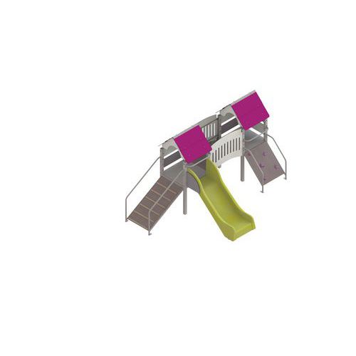 - Composée de deux tours avec toit, une rampe, un petit mur d’escalade, un passage et un toboggan.
