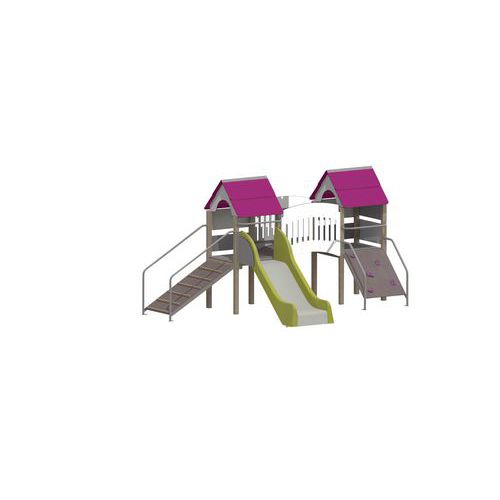 - Composée de deux tours avec toit, une rampe, un petit mur d’escalade, un passage et un toboggan.