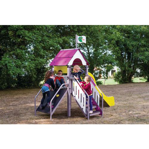 - Composée d’une tour avec toit, un escalier, un petit mur d’escalade et un toboggan.