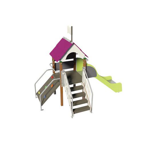 - Composée d’une tour avec toit, un escalier, un petit mur d’escalade et un toboggan.