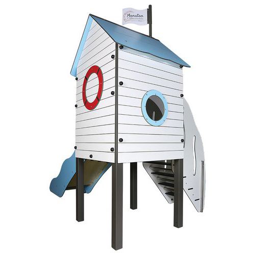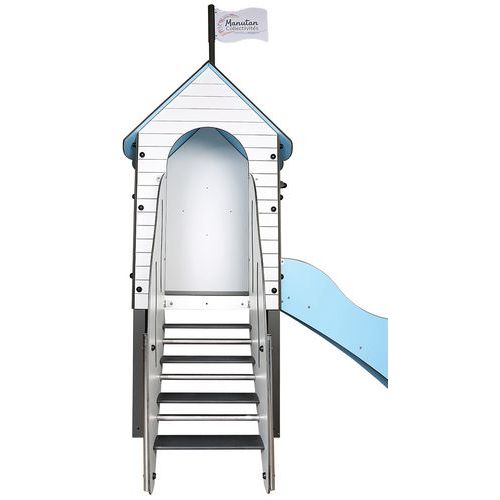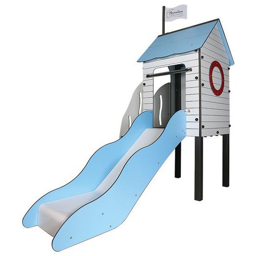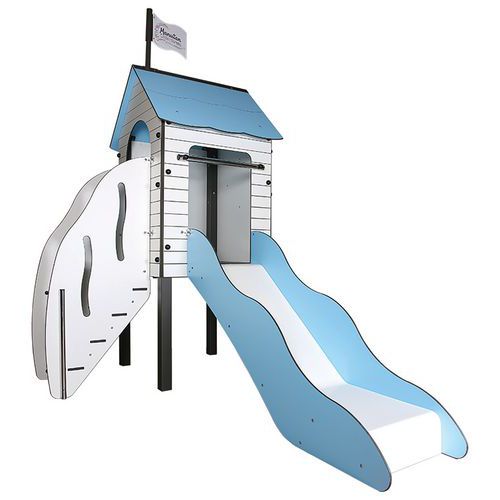 Cette structure sur le thème de la mer est composée d'une tour avec toit accessible par un escalier, un hublot pour observer l'horizon et un toboggan (glissière ouverte en polyester et bord en HPL)