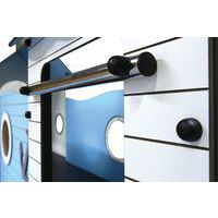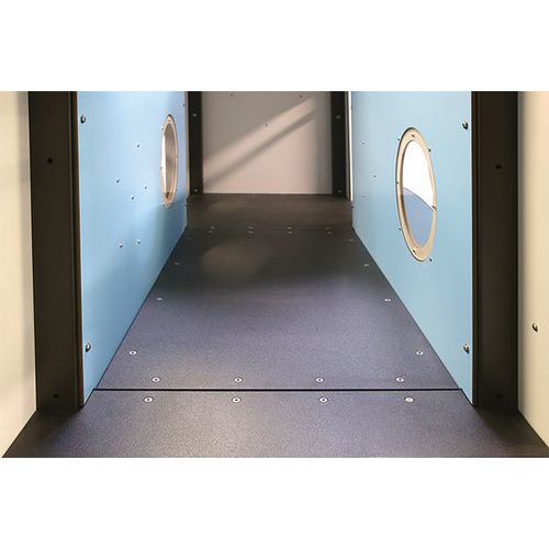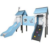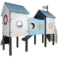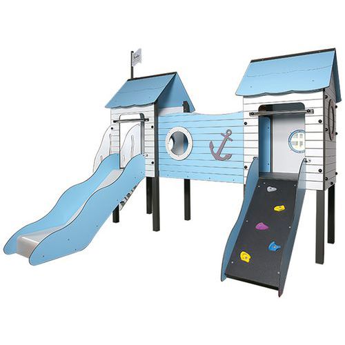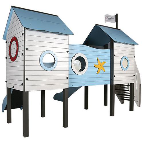 Composée de 2 tours avec toit, un escalier, un toboggan (glissière ouverte en polyester et bord en HPL), hublots pour observer l'horizon, 1 mur à grimper, 1 pont