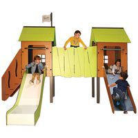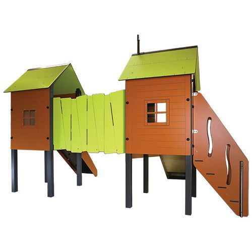 - Composée de 2 tours avec toit, un escalier, un toboggan (glissière ouverte en polyester et bord en HPL), 1 mur à grimper, 1 pont