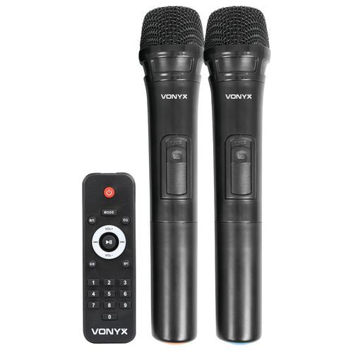 Livré avec : 2 microphones UHF, 1 télécommande