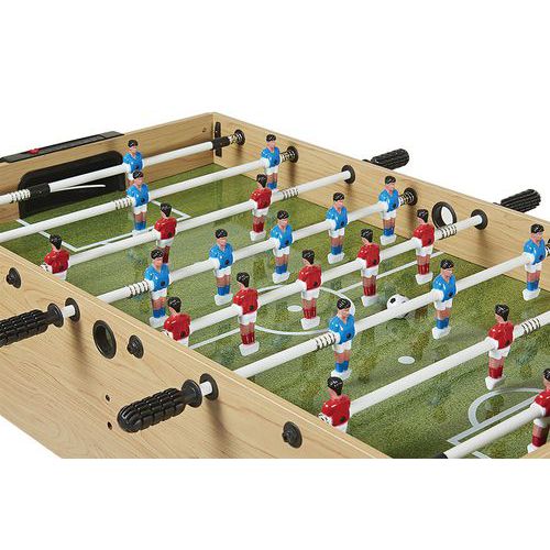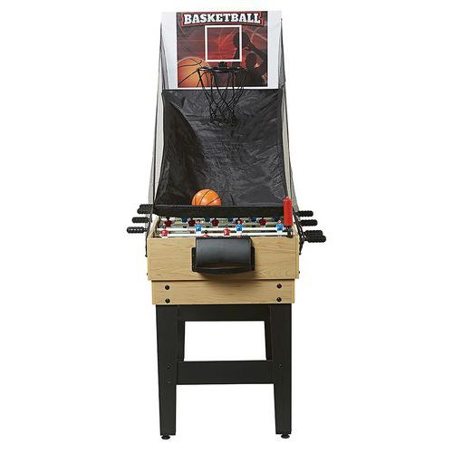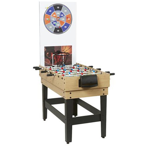 Table de jeu multifonctions avec 8 jeux différents dans le même meuble : baby foot (barres télescopiques, joueurs plastique), billard, hockey, tennis de table, basketball, jeu de fléchettes (sécurisé à ventouse), tir à l’arc (sécurisé à ventouse), casse boites.