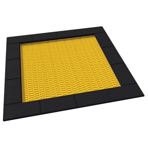 Trampoline PAKO destiné à être utilisé sur des aires de jeux à usage intensif. Collier en caoutchouc EPDM. Structure en caisson métallique. Tapis de saut composé de lamelles Hercules très résistantes d'une largeur d'au moins 37 mm, en forme de V et renforcé par des nervures. Espaces entre les éléments du tapis réduits à seulement 7 mm, pour empêcher les petits objets de tomber dans le trampoline Toile de saut avec une surface antidérapante sous forme de saillies horizontales et circulaires alternées, enfilées sur un câble en acier inoxydable dans une housse souple. Ressorts fixant le tapis, situés autour du périmètre de la structure, reliés à un cordon métallique avec un oeillet renforcé spécial ou une tige métallique reliant les éléments du tapis, ce qui empêche l'abrasion des câbles lors de leur utilisation. Garantie structure inox : 10 ans. Garantie parties métalliques aluminium et polyéthylène : 5 ans. Garantie cordes, clips, connecteurs, revêtements peints : 2 ans. Garantie roulements, ressorts, pièces de fixations pour balançoire : 1 an. Livré démonté. Autres coloris disponibles sur demande