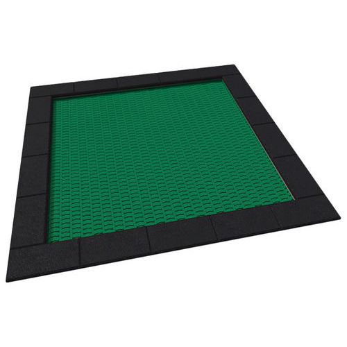 Trampoline PAKO destiné à être utilisé sur des aires de jeux à usage intensif. Collier en caoutchouc EPDM. Structure en caisson métallique. Tapis de saut composé de lamelles Hercules très résistantes d'une largeur d'au moins 37 mm, en forme de V et renforcé par des nervures. Espaces entre les éléments du tapis réduits à seulement 7 mm, pour empêcher les petits objets de tomber dans le trampoline Toile de saut avec une surface antidérapante sous forme de saillies horizontales et circulaires alternées, enfilées sur un câble en acier inoxydable dans une housse souple. Ressorts fixant le tapis, situés autour du périmètre de la structure, reliés à un cordon métallique avec un oeillet renforcé spécial ou une tige métallique reliant les éléments du tapis, ce qui empêche l'abrasion des câbles lors de leur utilisation. Garantie structure inox : 10 ans. Garantie parties métalliques aluminium et polyéthylène : 5 ans. Garantie cordes, clips, connecteurs, revêtements peints : 2 ans. Garantie roulements, ressorts, pièces de fixations pour balançoire : 1 an. Livré démonté. Autres coloris disponibles sur demande