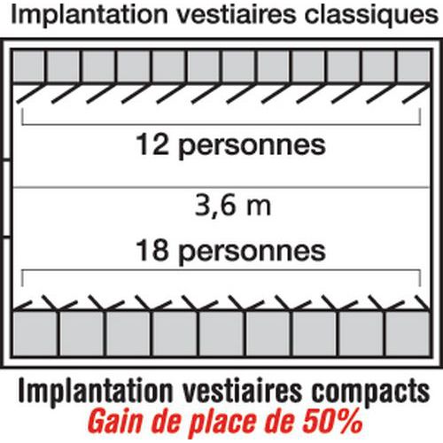 Vestiaire industrie propre monobloc métallique. Chaque colonne comporte 2 vestiaires complets avec penderie et casiers. Montants profilés, fermés et agrafés pour une résistance renforcée du vestiaire. Portes battantes indégondables et articulées, ouverture optimale à 180°, avec porte-étiquette clipsé. Fermeture 3 points par serrure à clé, très résistante et silencieuse (2 clés fournies). Aération en façade pour une meilleure ventilation, et pré-perçage pour juxtaposition. Colonne prévue pour le rangement des effets de 2 personnes. Pieds en polypropylène, permettant uine installation en milieu humide, et vérins de mise à niveau. Hauteur : 100 mm. Surface d'appui Ø 30 mm pour éviter le poinçonnement sur le revêtement de sol. Espace utile entre le dessus et la tablette : 285 mm, permettant le rangement des casques de chantier, motos, police. Hauteur penderie individuelle : 1070 mm.