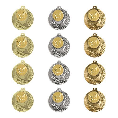 Lot de 12 médailles Challenge - Discipline au choix. 4 Or + 4 Argent + 4 Bronze. Livrées avec cordons 5mm.