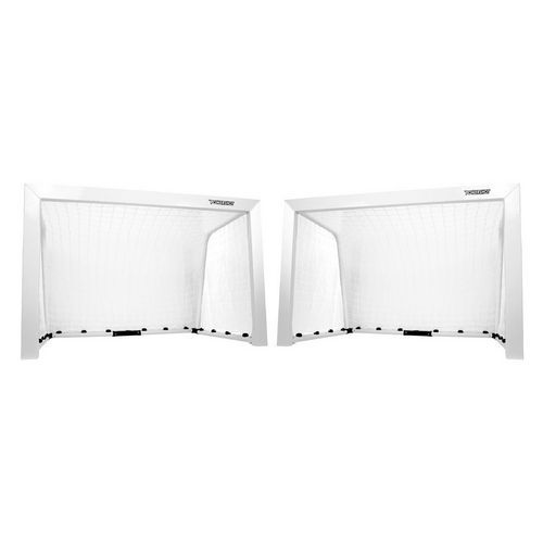 La structure très solide est également rabattable grâce aux supports latéraux qui se replient aisément (clips sur la barre transversale pour retenir les supports latéraux lors du transport du but).