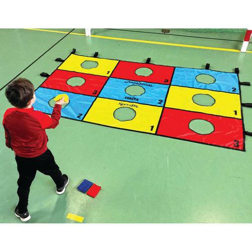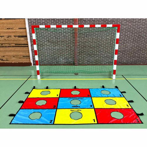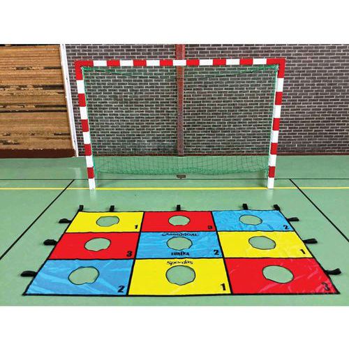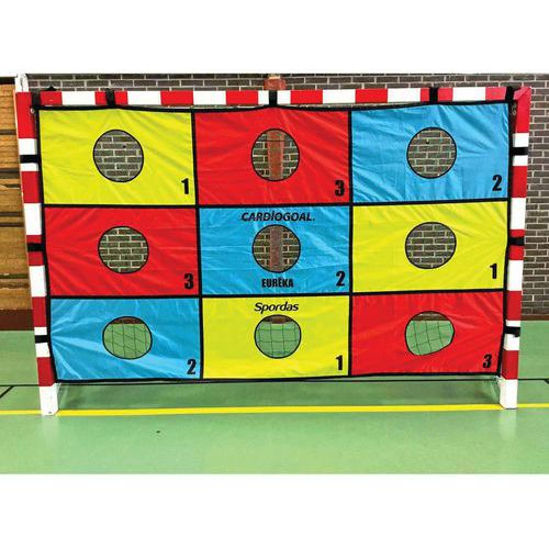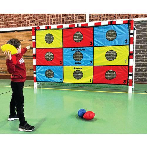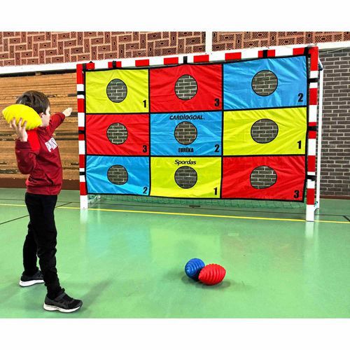 Le mur Eureka est facile et rapide à installer au sol (pour les jeux de lancer) ou à attacher à une cage de handball grâce à sa bande Velcro afin de travailler la précision des tirs à la main ou au pied.