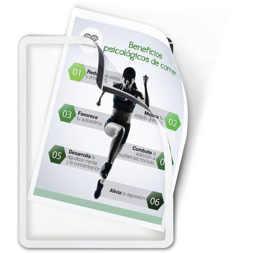 Pochette cadre adhésive avec impression double face, design en pointillés. Fermeture par 3 bandes adhésives : tenue parfaite du document. Affichage double face sur vitre grâce au cadre recto verso. Utilisation double orientation : portrait ou paysage. Pochette spécifique aux grands formats.