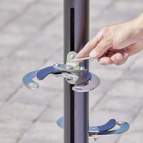 Avec blocage du mât, antivol par cadenas, câble ou antivol en U (non fourni).