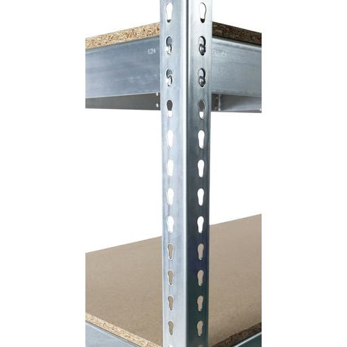 Rayonnage industriel simple et robuste pour stockage des marchandises de charge moyenne. Tablette aggloméré parfaite pour l'entrepôt des petites pièces en vrac et contenants divers. Finitions résistantes aux chocs et aux environnements divers : zinguée et époxy gris/bleu. Étagère d'entrepôt de montage facile, sans l'aide de techniciens ni d'outils spécifiques.