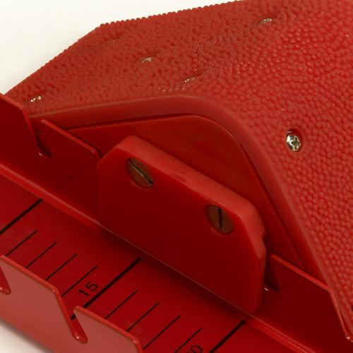 Modèle droitier tous terrains (pistes synthétiques et cendrées) avec glissière centrale à double crémaillère avec 14 positions (réglable en écart de pied de 0 à 60 cm), patins (hauteur 9 cm) recouverts de caoutchouc soft.