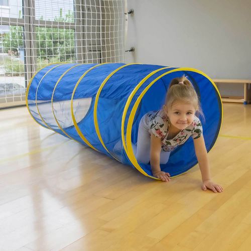 Tunnel bleu avec fenêtre, il permet aux enfants d'apprendre à ramper en toute sécurité.