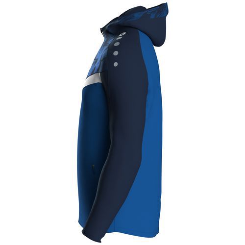 Veste à capuche Iconic Jako Insertion jacquard Poches latérales avec fermeture éclair Les fibres microfines évacuent directement l'humidité à la surface du tissu Le matériau sèche très rapidement, protège du refroidissement et préserve une agréable sensation corporelle pendant le sport Coloris : Bleu foncé Garantie client : 1 an Personnalisable