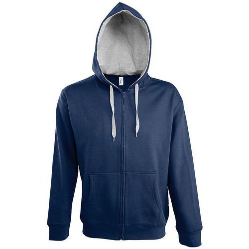 Veste zippée à capuche 50% coton / 50% polyester avec intérieur molleton pour un meilleur confort, finition bas de veste et bas des manches en bord-côte élastique uni , 2 poches kangourou sur le devant, capuche doublée et contrastée avec cordon de serrage contrasté.