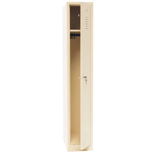 Vestiaire acier robuste à portes renforcées. Ouverture optimale à 180° et charnières invisibles. Hygiénique avec une aération haute et basse des portes. Perforations pour accroche murale, porte-étiquette embouti.