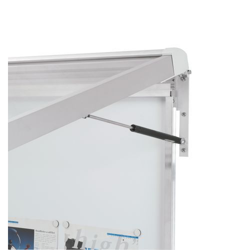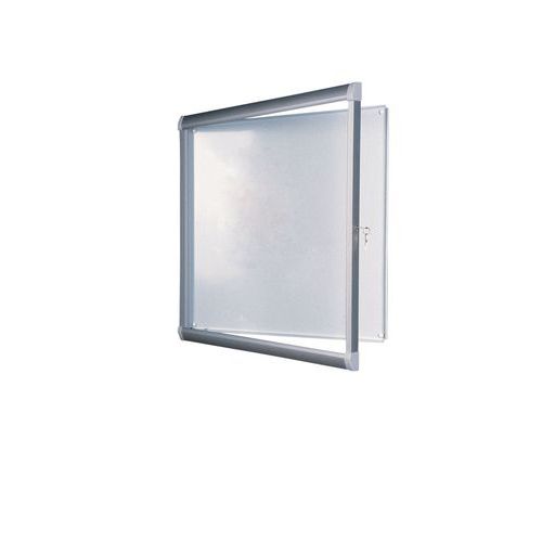 Vitrine d'affichage extérieur effacable à sec et magnétique. Porte battante de haute résistance aux chocs thermiques, en plexiglass. Verrouillage par serrure. Fixation murale. Étanchéité parfaite à l'eau grâce aux deux joints verticaux. Fond en aluminium.